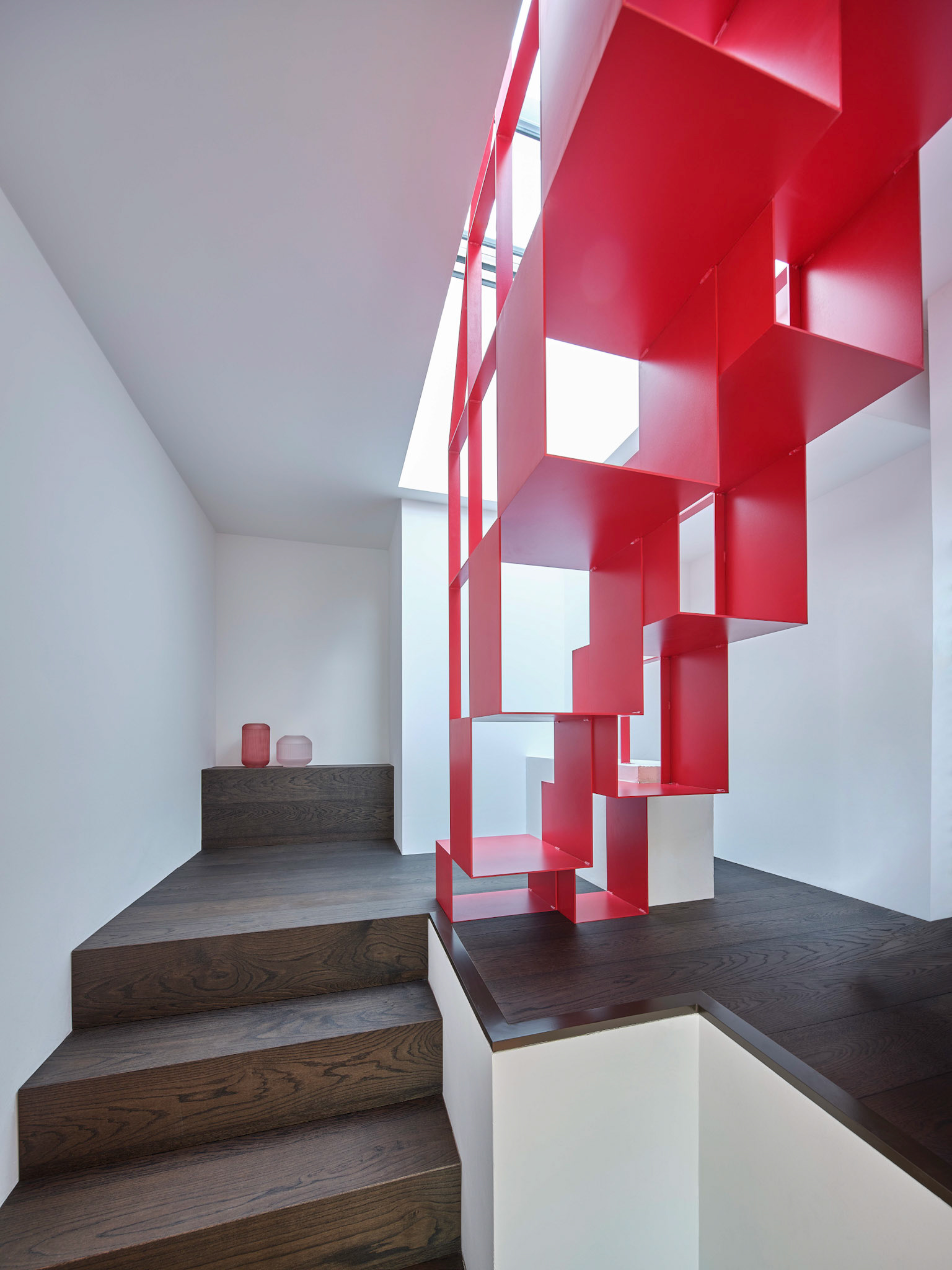 Reduzierte Materialien, klare Linien und ausgewählte Akzente – wie eine skulpturale Treppe – schaffen eine ruhige, hochwertige Atmosphäre.