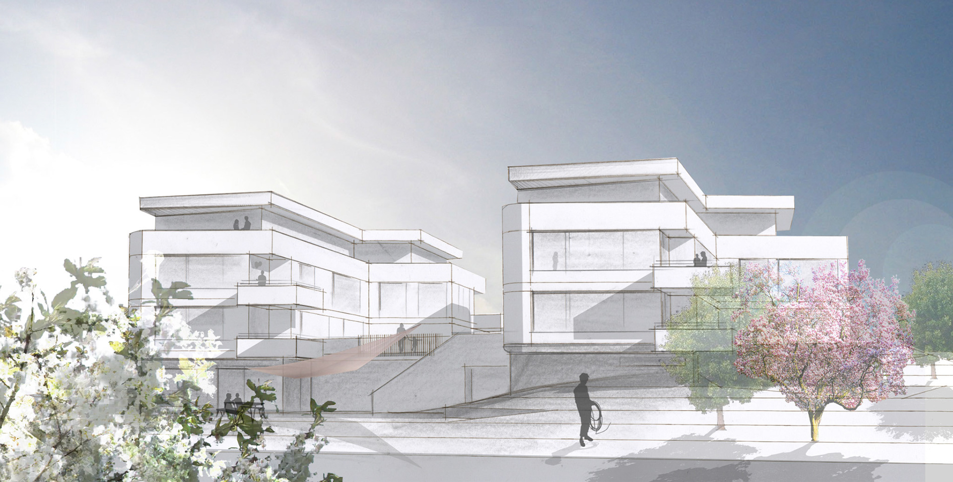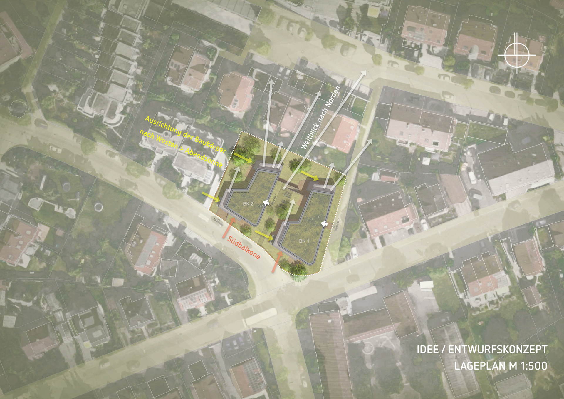 Die Wohnungen erhalten jeweils Balkone nach Westen oder Süden. Die Westbalkone ermöglichen gleichzeitig ein großzügiges Erleben der Aussichtslage. Die Tiefgarage inklusive Nebenräume und einer Fläche für einen Gemeinschaftsraum befindet sich im Hanggeschoss (kein Vollgeschoss) und bildet als Sockel wie selbstverständlich eine Verbindung der beiden Hauptbaukörper.