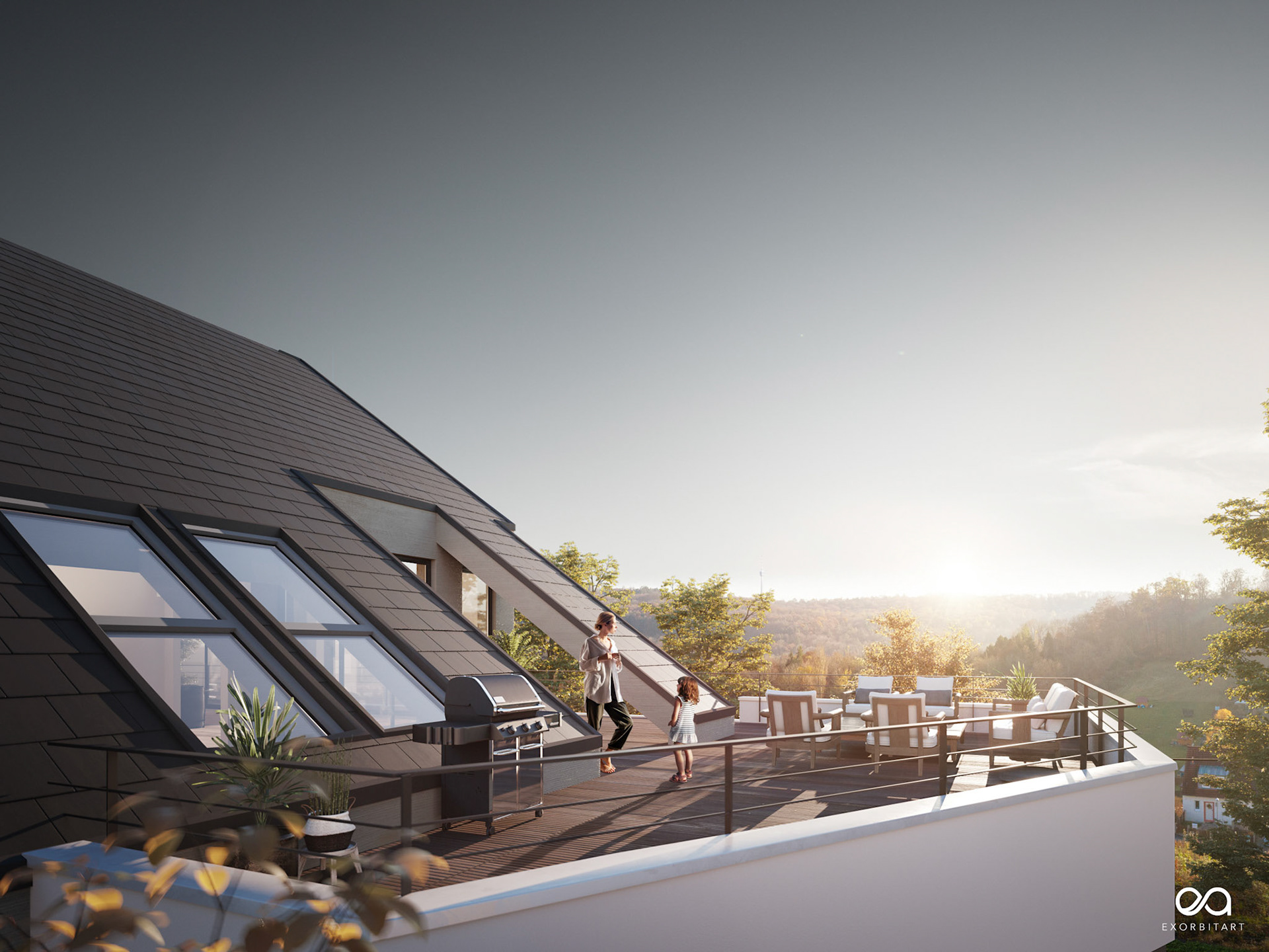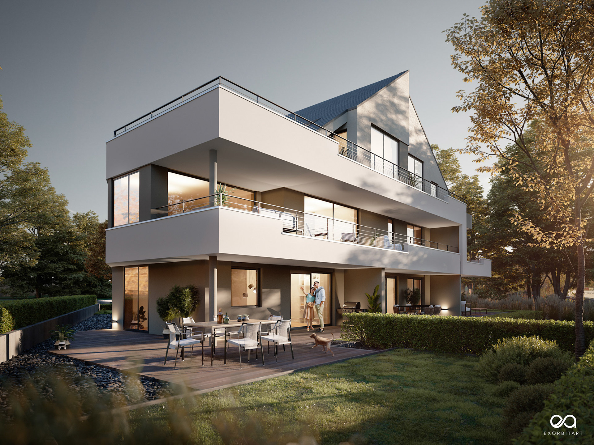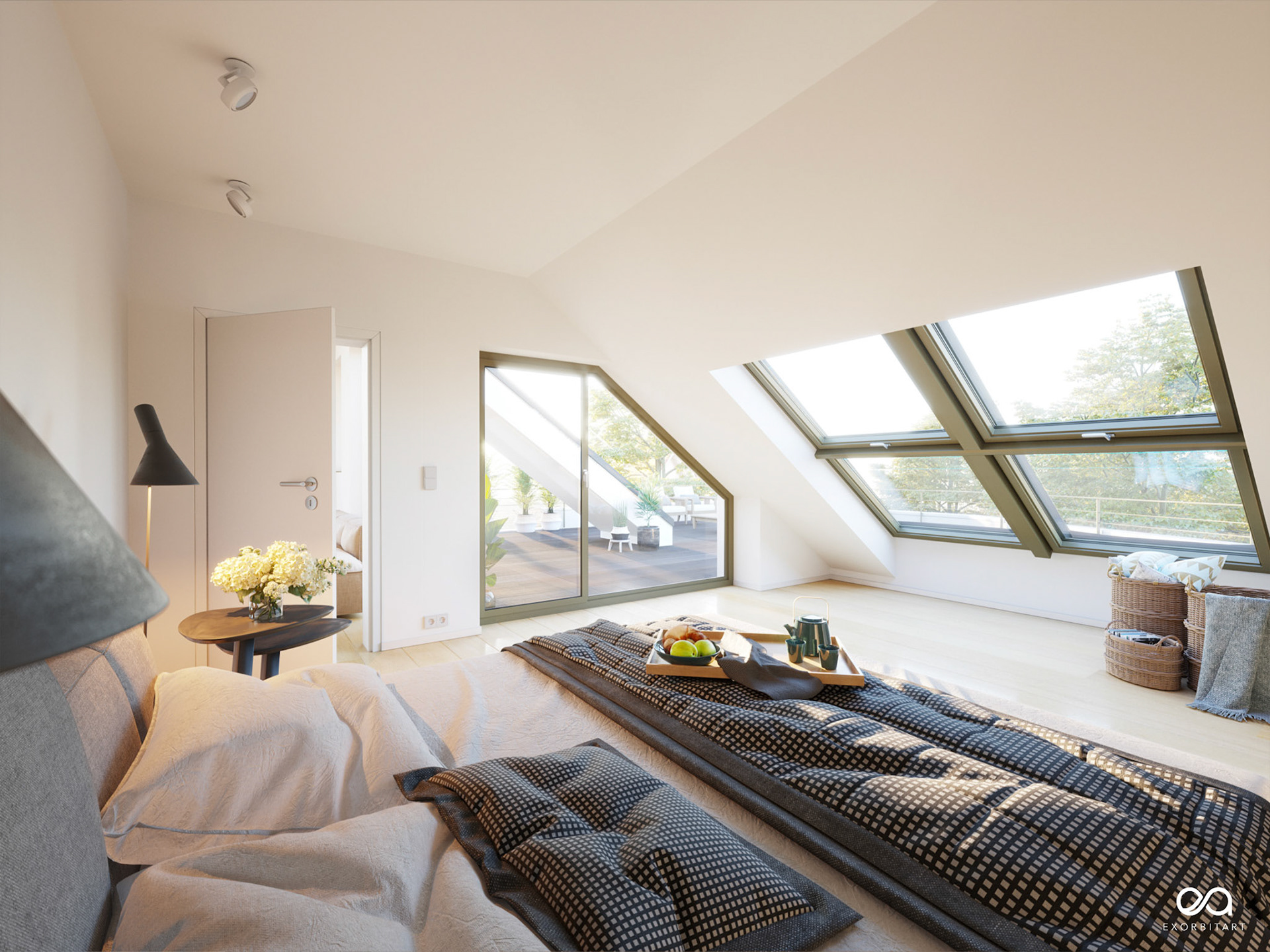 Die Wohnungen orientieren sich konsequent zu diesen Außenräumen. Großformatige Verglasungen und fließende Übergänge stärken die Verbindung zwischen Innen und Außen und ermöglichen vielfältige Ausblicke in die Umgebung.